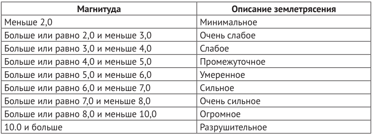 Диапазоны магнитуд землетрясений по шкале Рихтера с описаниями: