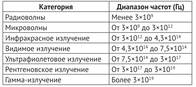 Электромагнитные волны можно классифицировать по частоте на семь категорий, как показано ниже: