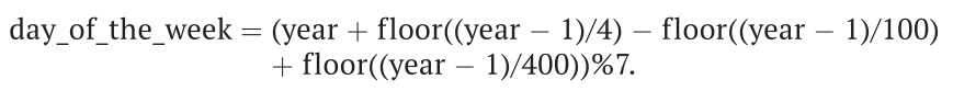 day_of_the_week = (year + int((year - 1) / 4) - int((year - 1) / 100) + int((year - 1) / 400)) % 7