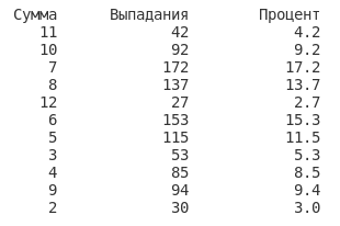 print("%10s%15s%15s" % ("Сумма", "Выпадания", "Процент"))