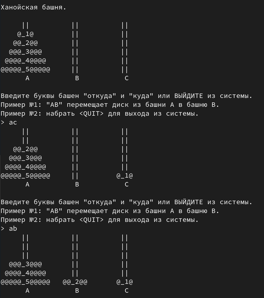 print('Пример №1: "AB" перемещает диск из башни A в башню B.')